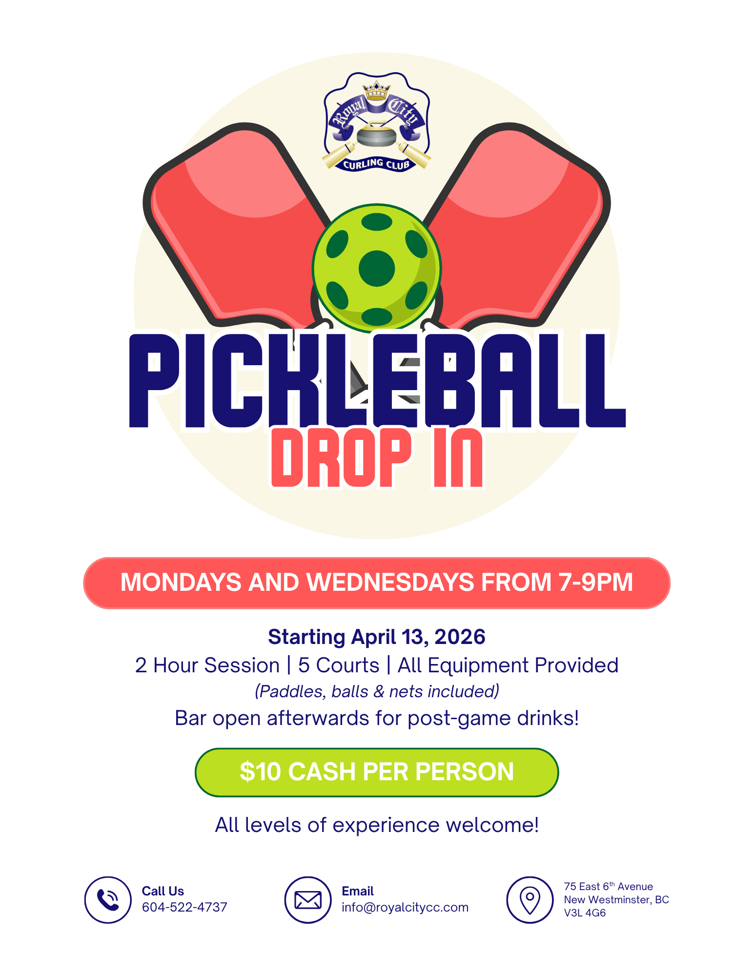 Join us on Mondays and Wednesdays from 7-9PM for drop-in pickleball. Only $10 cash per person with all equipment provided. All levels welcome! Click here to view the poster.