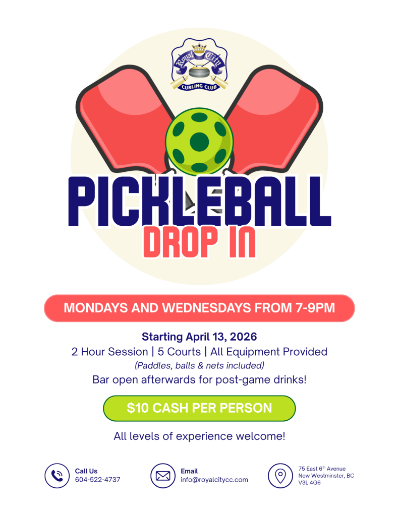 The Royal City Curling Club offers top-tier curling ice, video analysis, a fully stocked Pro Shop, and great food and drinks in our bistro and lounge. In the summer, we switch things up with 5 pickleball courts plus events like Burger & Beer Nights, Bingo, and more.