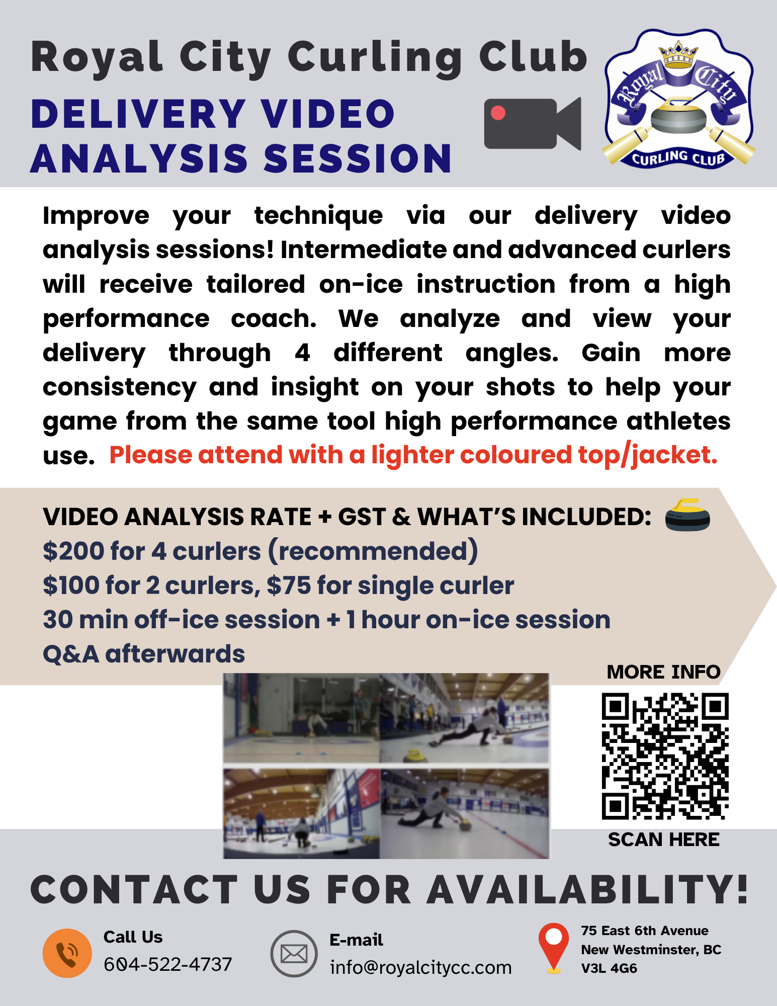 For more information on our Delivery Video Analysis or to enquire about available dates, please e-mail info@royalcitycc.com or call the office 604-522-4737. Please advise what days of the week and times of day will work for your event.